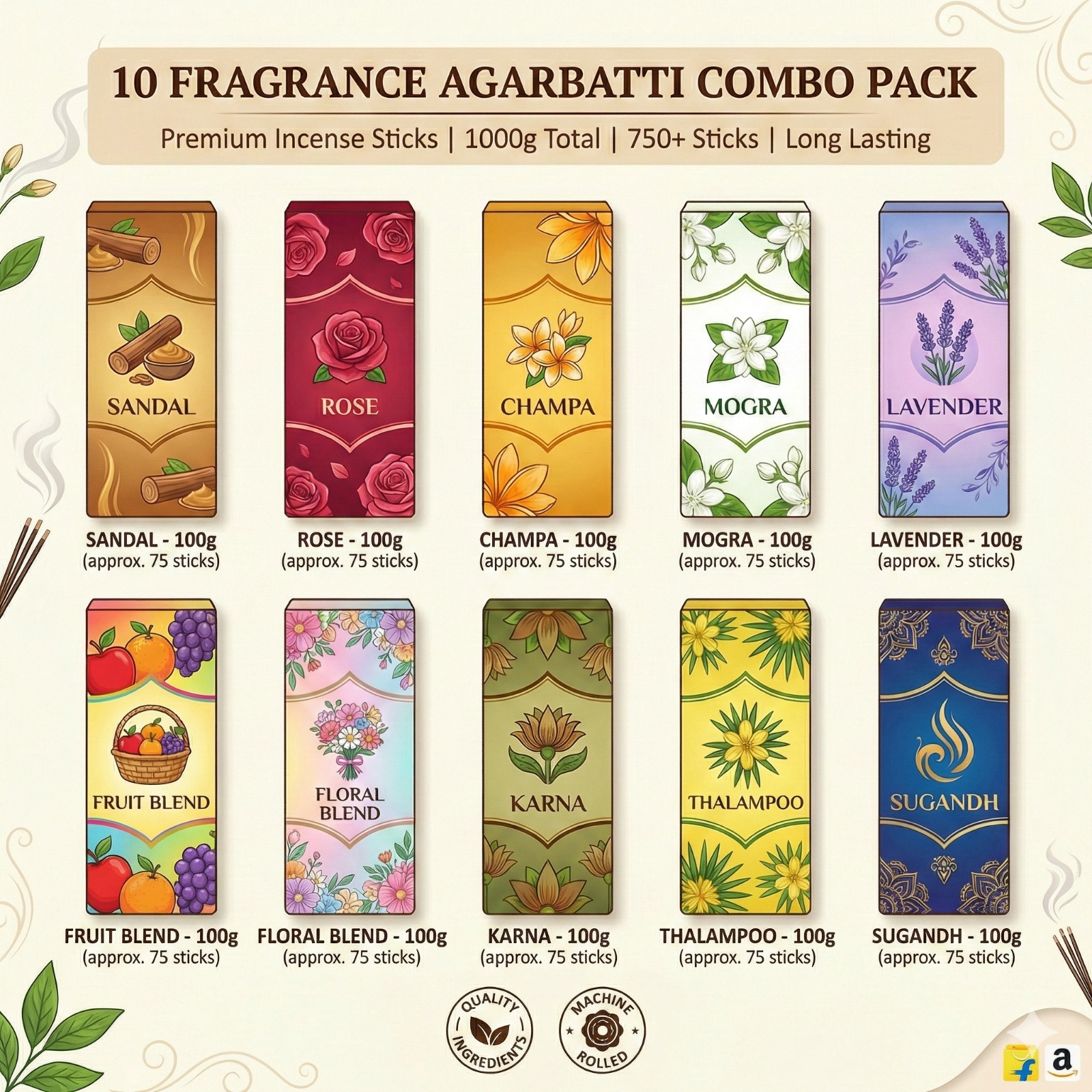 10 Fragrances | 750+ Sticks | 1 Kg Total | 30+ Min Burn